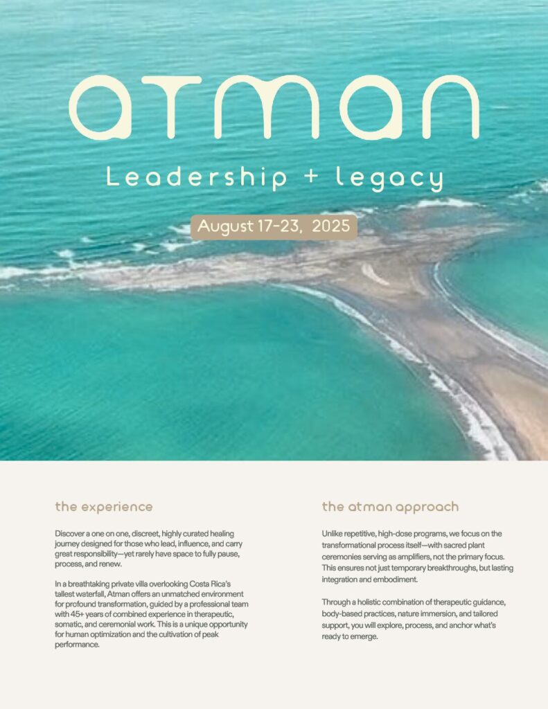 Discover a one on one, discreet, highly curated healing journey designed for those who lead, influence, and carry great responsibility—yet rarely have space to fully pause, process, and renew.In a breathtaking private villa overlooking Costa Rica’s tallest waterfall, Atman offers an unmatched environment for profound transformation, guided by a professional team with 45+ years of combined experience in therapeutic, somatic, and ceremonial work. This is a unique opportunity for human optimisation and the cultivation of peak performance